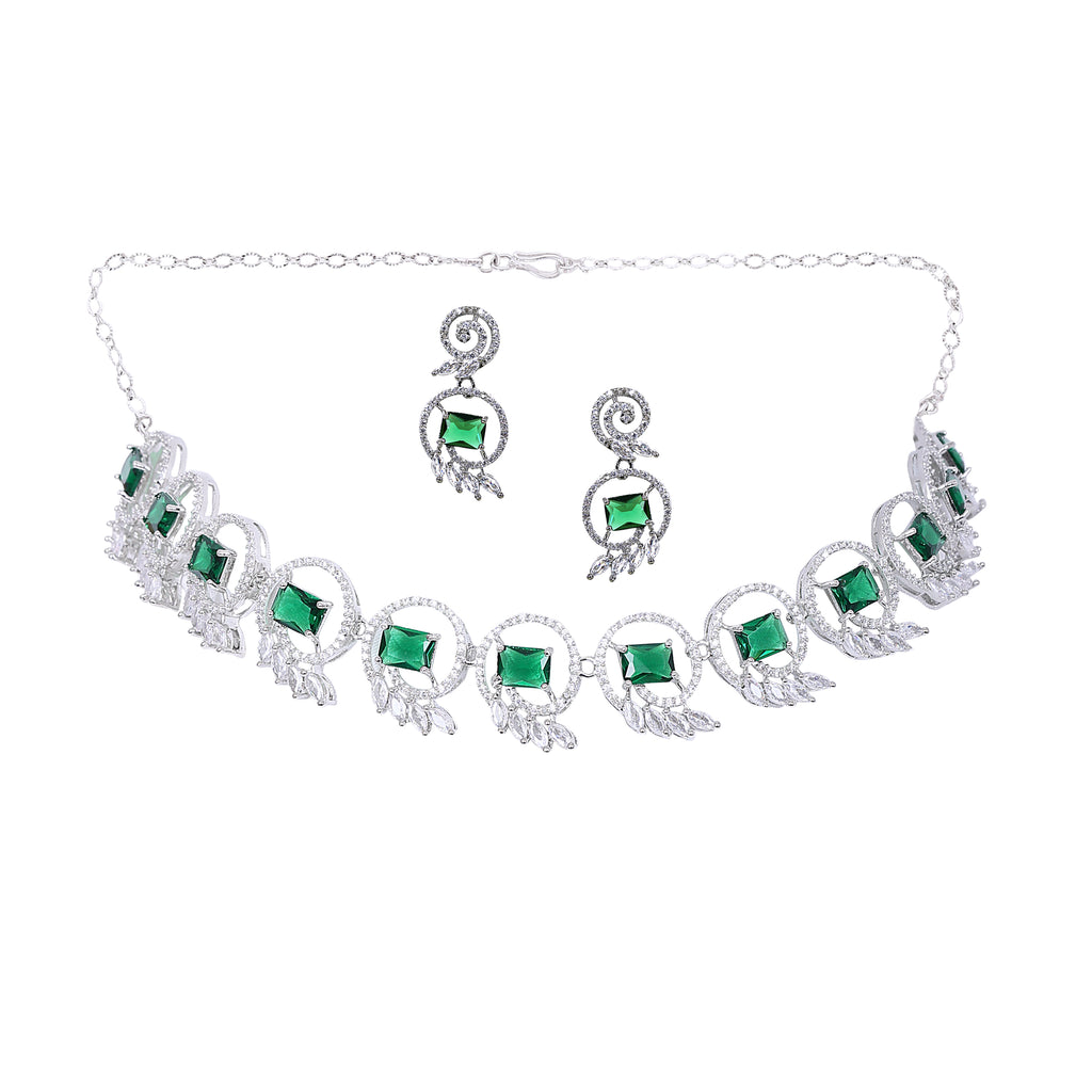Add a touch of elegance to your look with this stunning Silver-Plated Emerald Green Necklace Set, beautifully crafted with sparkling CZ crystals and deep green square stones. The necklace features a graceful pattern of circular motifs and leaf-inspired detailing, giving it a modern yet sophisticated finish.