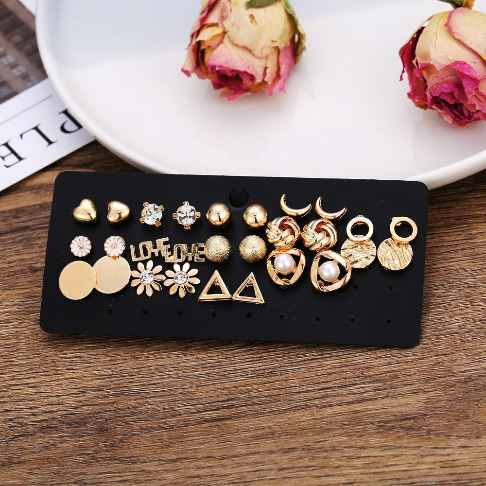 12 stylish pairs – hearts, florals, pearls, geometric shapes & mini hoops