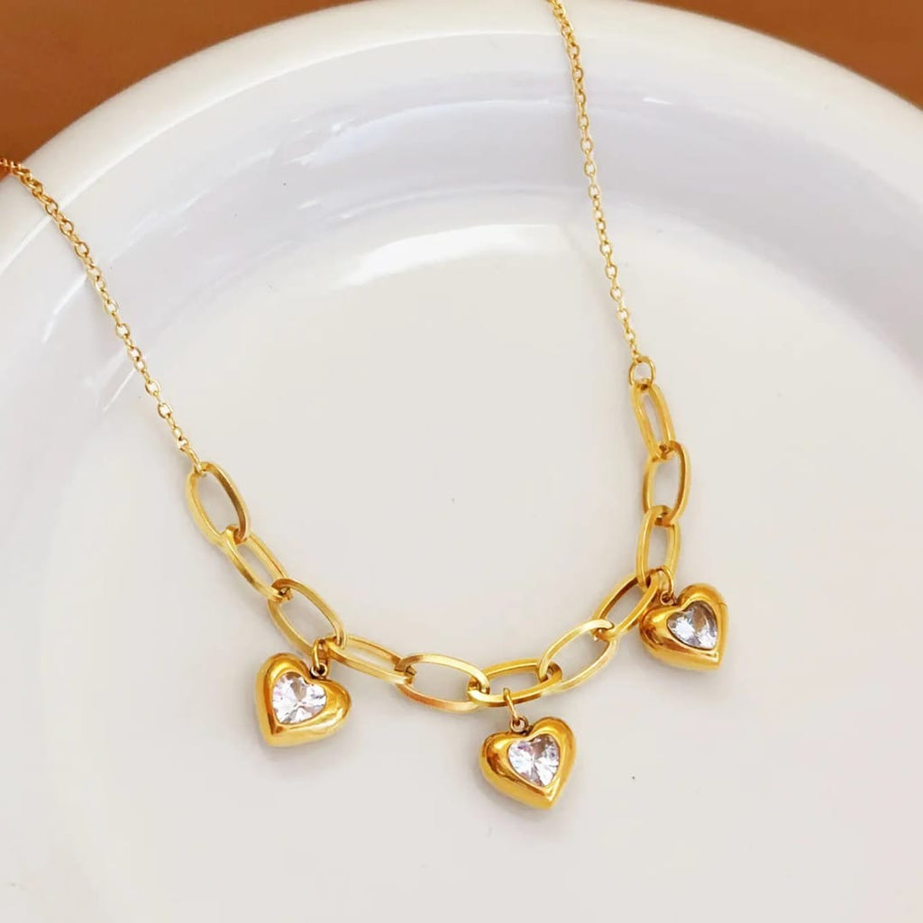 Elevate your everyday style with this beautifully crafted anti-tarnish gold necklace, designed to stay shiny and vibrant with long-lasting wear. Featuring elegant gold link chains and three dangling heart charms accented with sparkling crystal centers, this piece adds the perfect touch of romance and sophistication to any outfit.