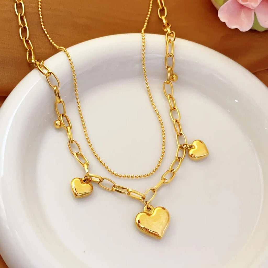 Elevate your look with this stunning layered gold necklace, featuring a delicate chain paired with a bold link chain adorned with shiny gold heart charms. Designed with a waterproof and anti-tarnish finish, this piece keeps its bright golden shine even with daily wear.
