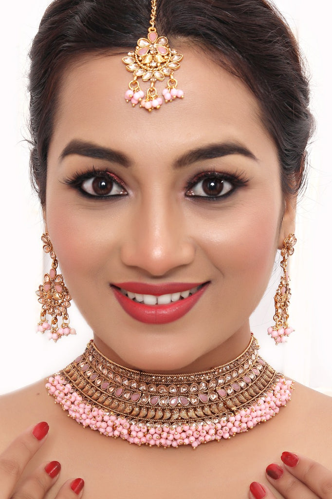 Enhance your bridal or festive look with this exquisite Kundan Choker Jewellery Set, beautifully handcrafted with shimmering stones and soft pink bead detailing. The set includes a statement choker necklace, a pair of matching earrings, and a maangtika, making it a complete traditional ensemble for weddings, receptions, and cultural events.